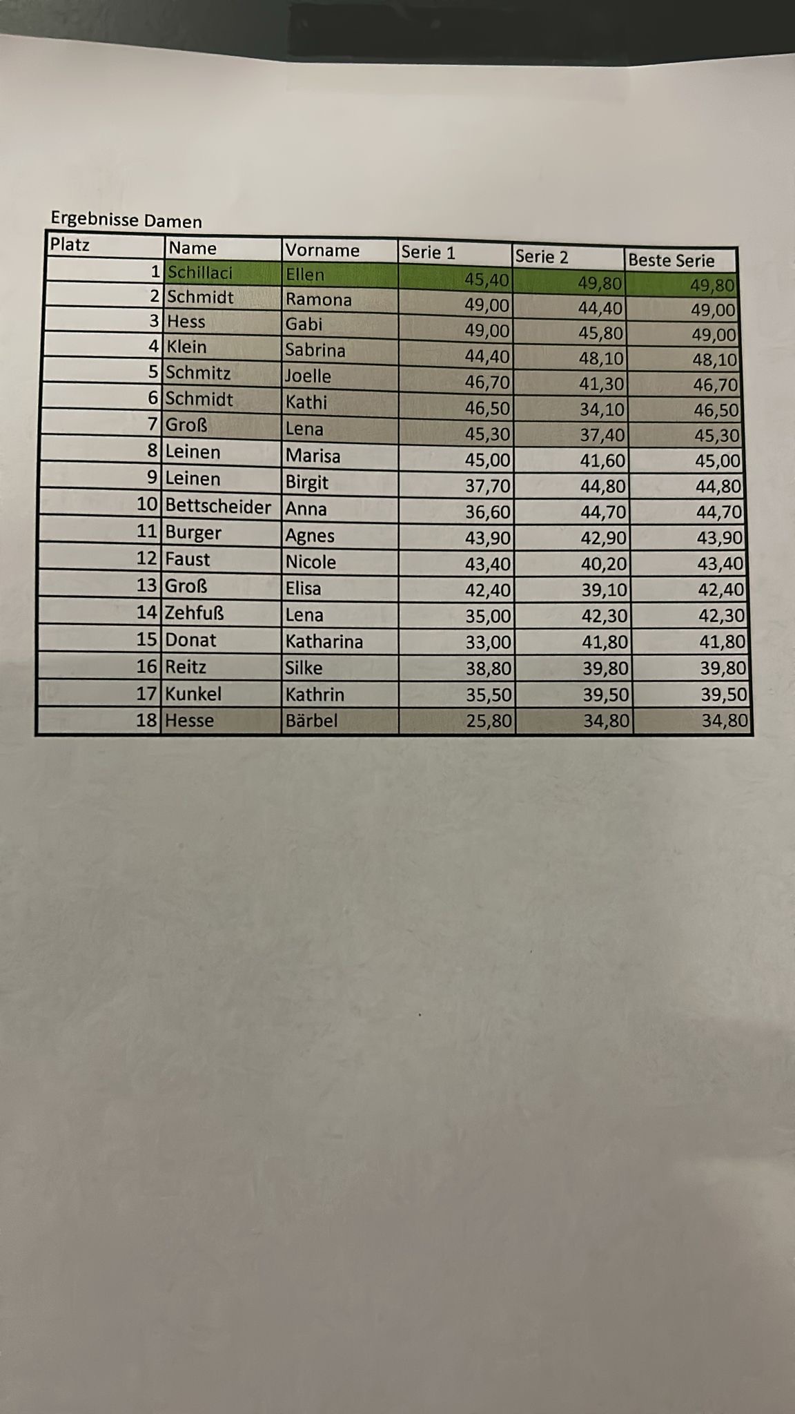Ergebnisliste Damen 27-09-25 Veröffentlicht 29. September 2025 um 1152 × 2048 in Ergebnisse Gemeindepokalschießen 27.09.2025 ← Vorheriger / Nächster → Ergebnisliste Damen